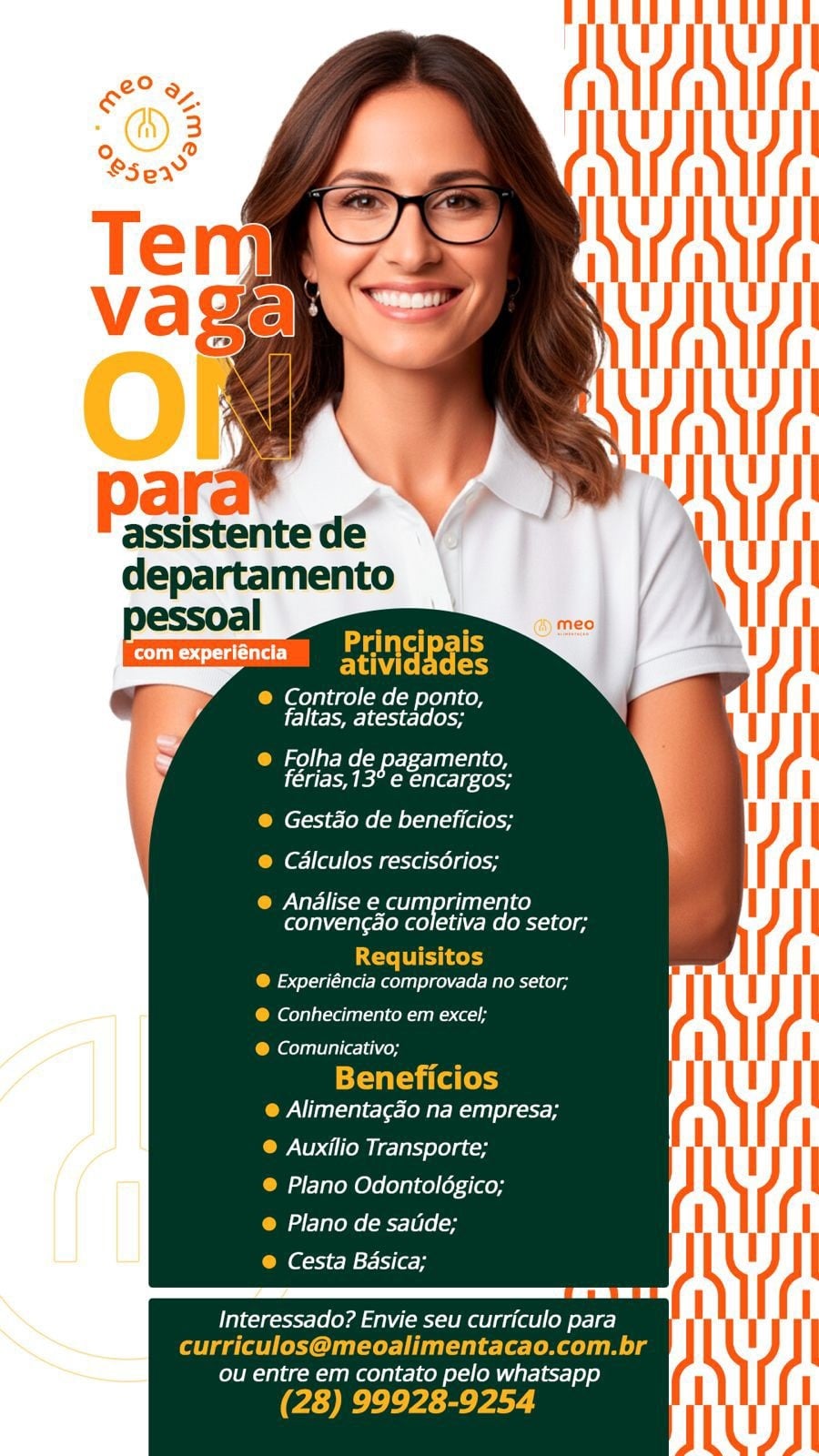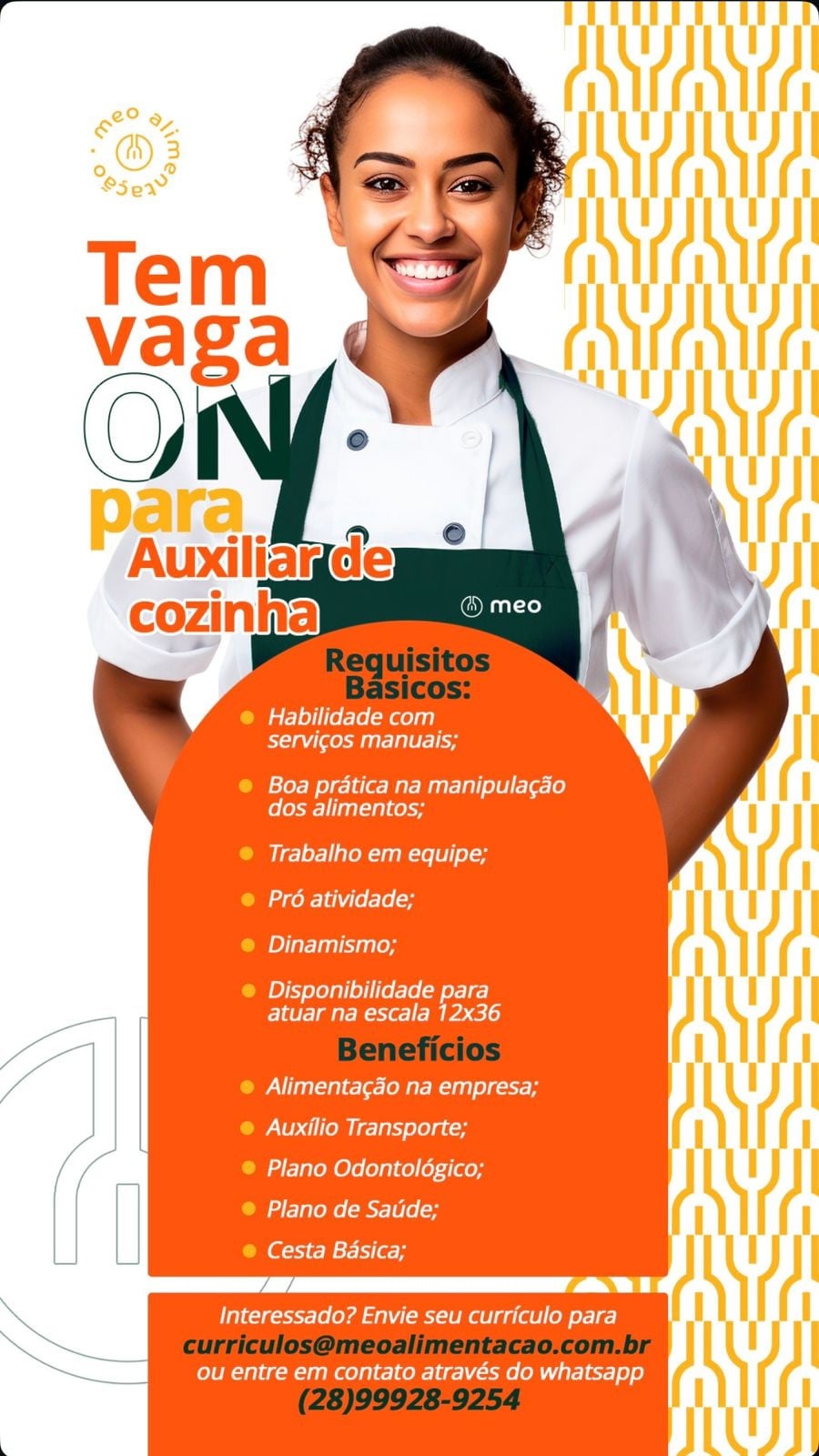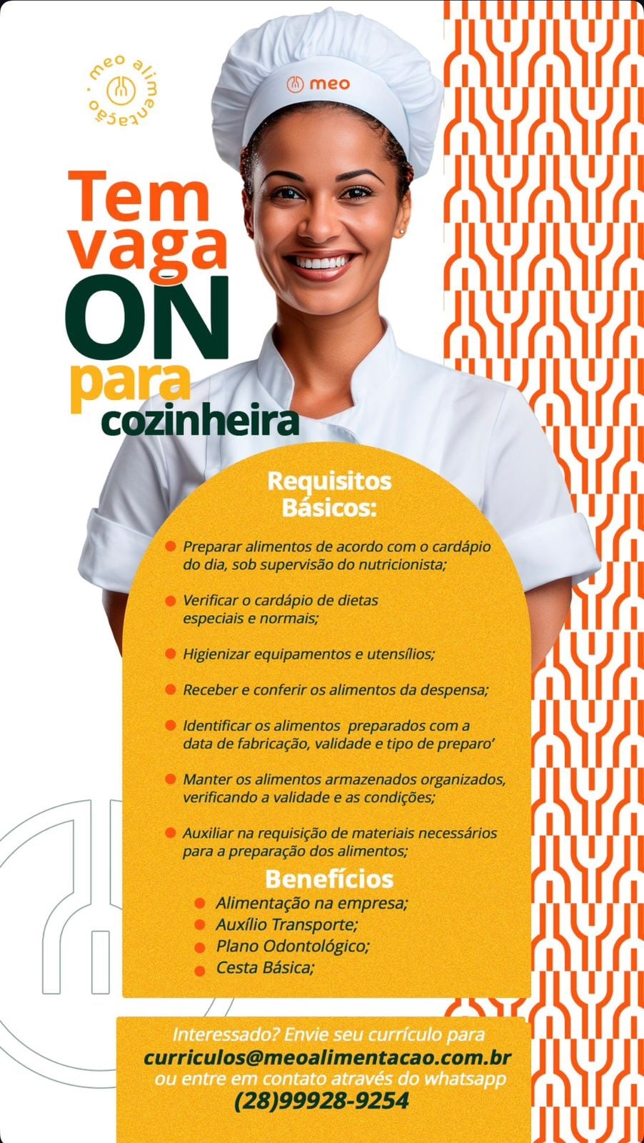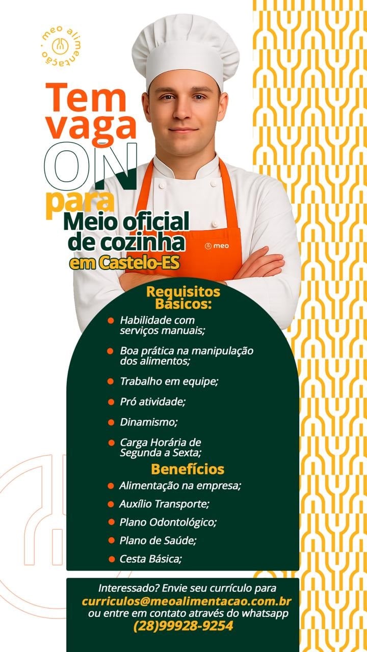 Segundo a empresa, as vagas de emprego buscam profissionais comprometidos e interessados em integrar a equipe. Por fim, a orientação é que os candidatos informem no currículo a função desejada. O processo seletivo segue conforme a demanda de cada área. Para mais informações sobre a empresa acesso o instagram @meo.alimentacao.
