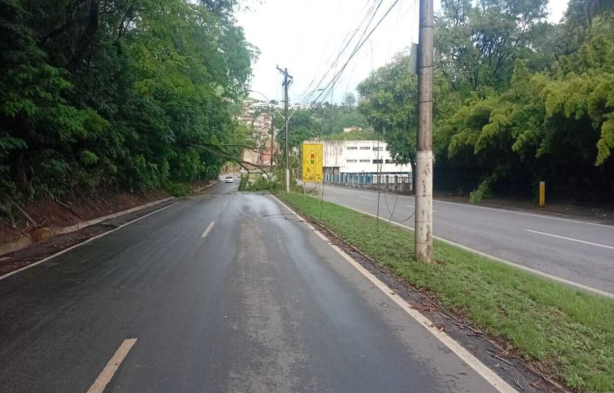 Uma árvore caiu transversalmente sobre a Rodovia Engenheiro Fabiano Vivacqua, nas imediações da antiga Viação Itapemirim, em Cachoeiro neste domingo (4).