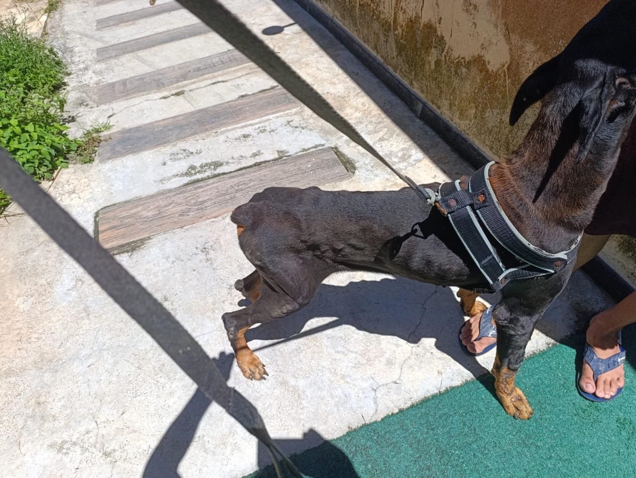 Forças de segurança encontraram um dobermann em estado grave; outro cachorro morreu no local.