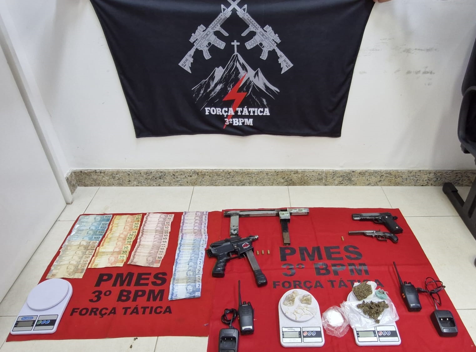 Na ação, a Força Tática apreendeu uma garrucha calibre .32 e uma submetralhadora caseira em fase de fabricação. Além disso, os policiais recolheram munições, simulacro de arma, drogas, balanças de precisão e rádios comunicadores.