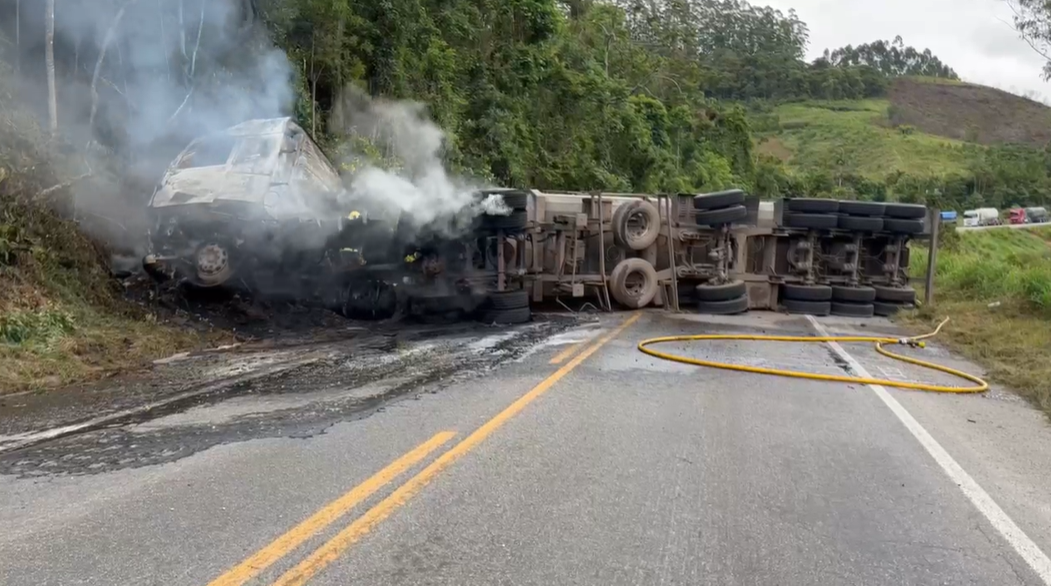 Com o deslocamento da carga, a carreta tombou. Em seguida, o veículo incendiou, o que agravou a situação e provocou a interdição total da rodovia.