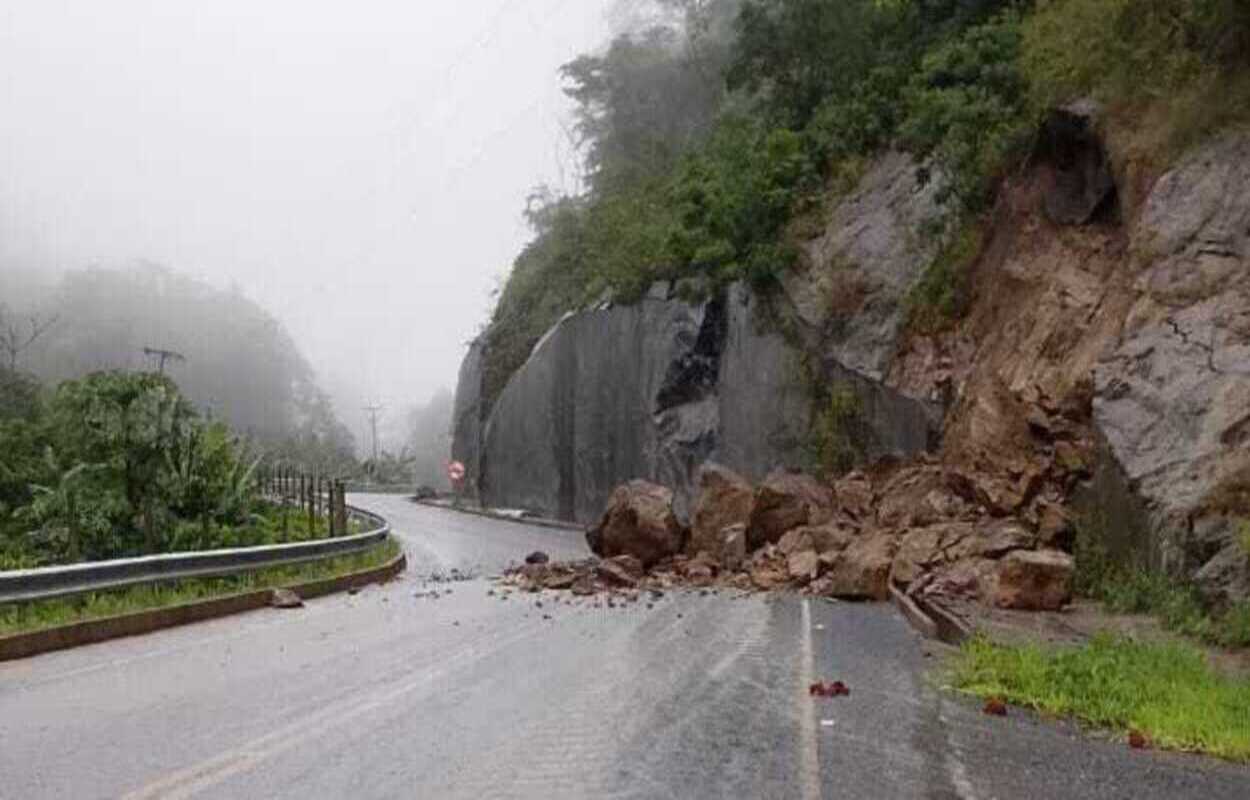 A rodovia ES-165 precisou ser interditada após um deslizamento de pedras na localidade de Serra dos Pontões, em Castelo.