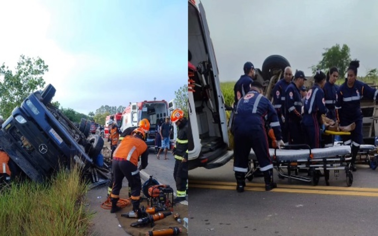 Imagens divulgadas pela imprensa local mostram um caminhão azul tombado às margens da estrada, com a cabine virada de lado em meio à vegetação. Também é possível observar equipes de resgate próximas ao veículo.