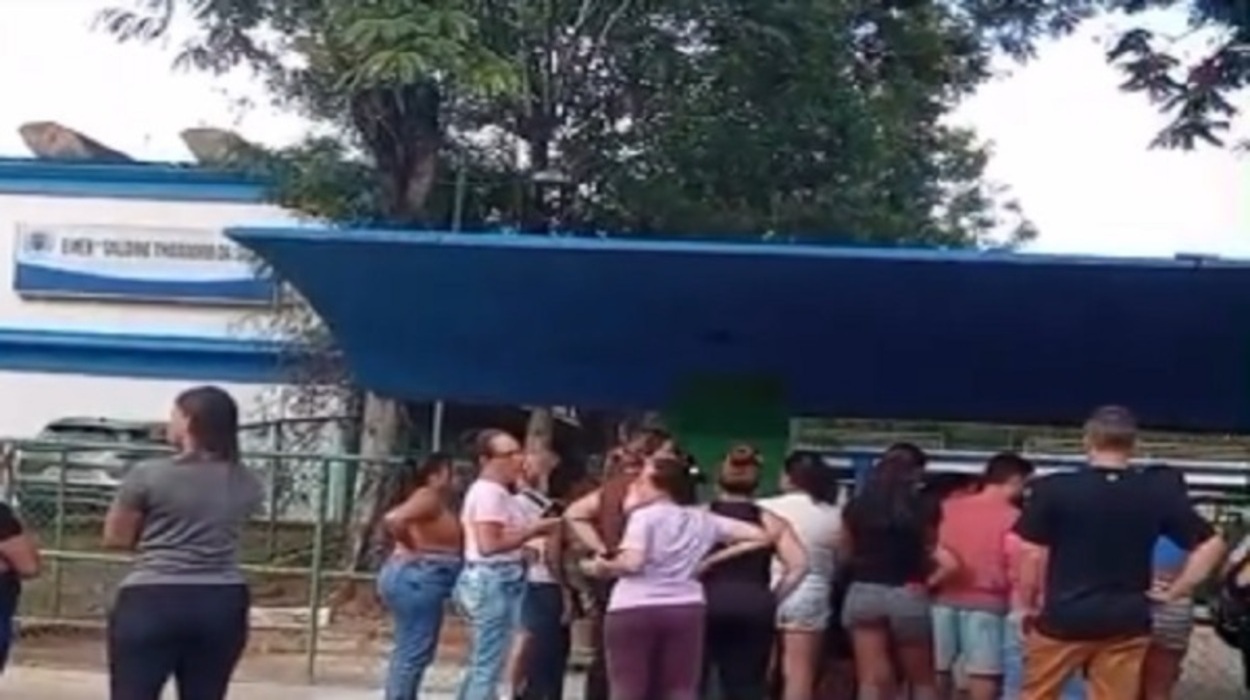 Um vídeo que circula nas redes sociais mostra um grupo de pais e responsáveis por alunos reunidos em frente à instituição. As pessoas aparecem concentradas próximas ao portão da unidade escolar.