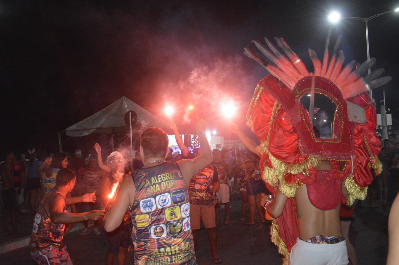 Cerca de 200 foliões se reuniram na Praia Central com samba e músicas da arquibancada