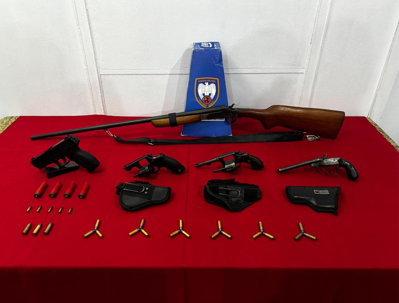 Na residência do conduzido, os policiais encontraram mais três armas de fogo. Entre elas estavam um revólver calibre .32, uma espingarda calibre .28 e uma garrucha calibre .32.