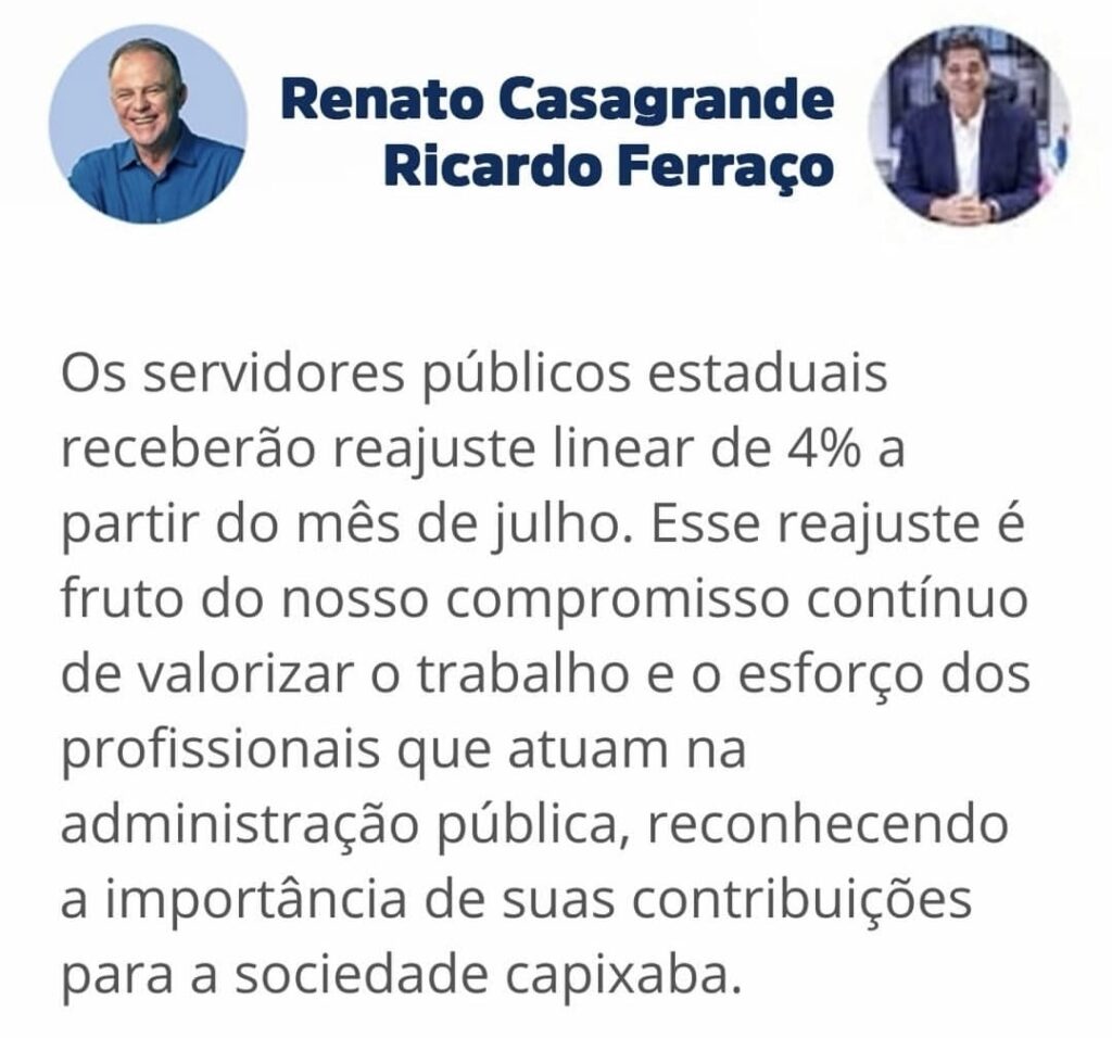 O governador do Espírito Santo, Renato Casagrande (PSB), anunciou que os servidores públicos estaduais receberão reajuste linear de 4% a partir do mês de julho. A informação foi divulgada pelo próprio chefe do Executivo por meio das redes sociais.