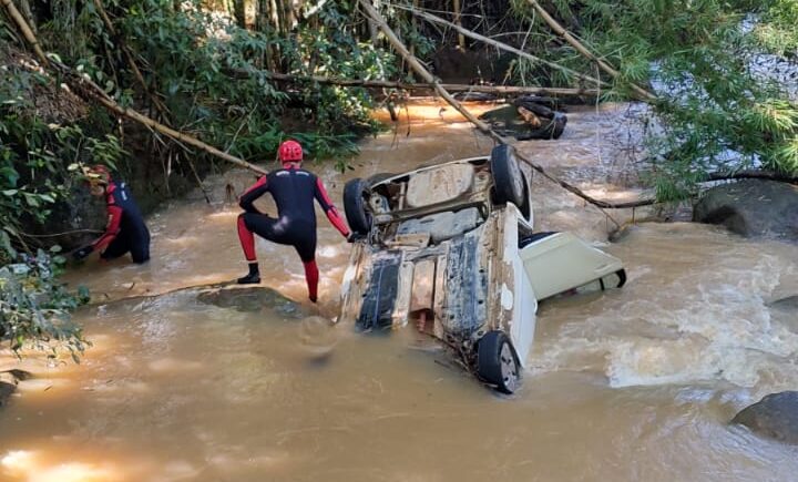 Ao chegarem ao local, os bombeiros identificaram um automóvel completamente capotado dentro do curso d’água. O veículo estava de cabeça para baixo, com parte da estrutura submersa.