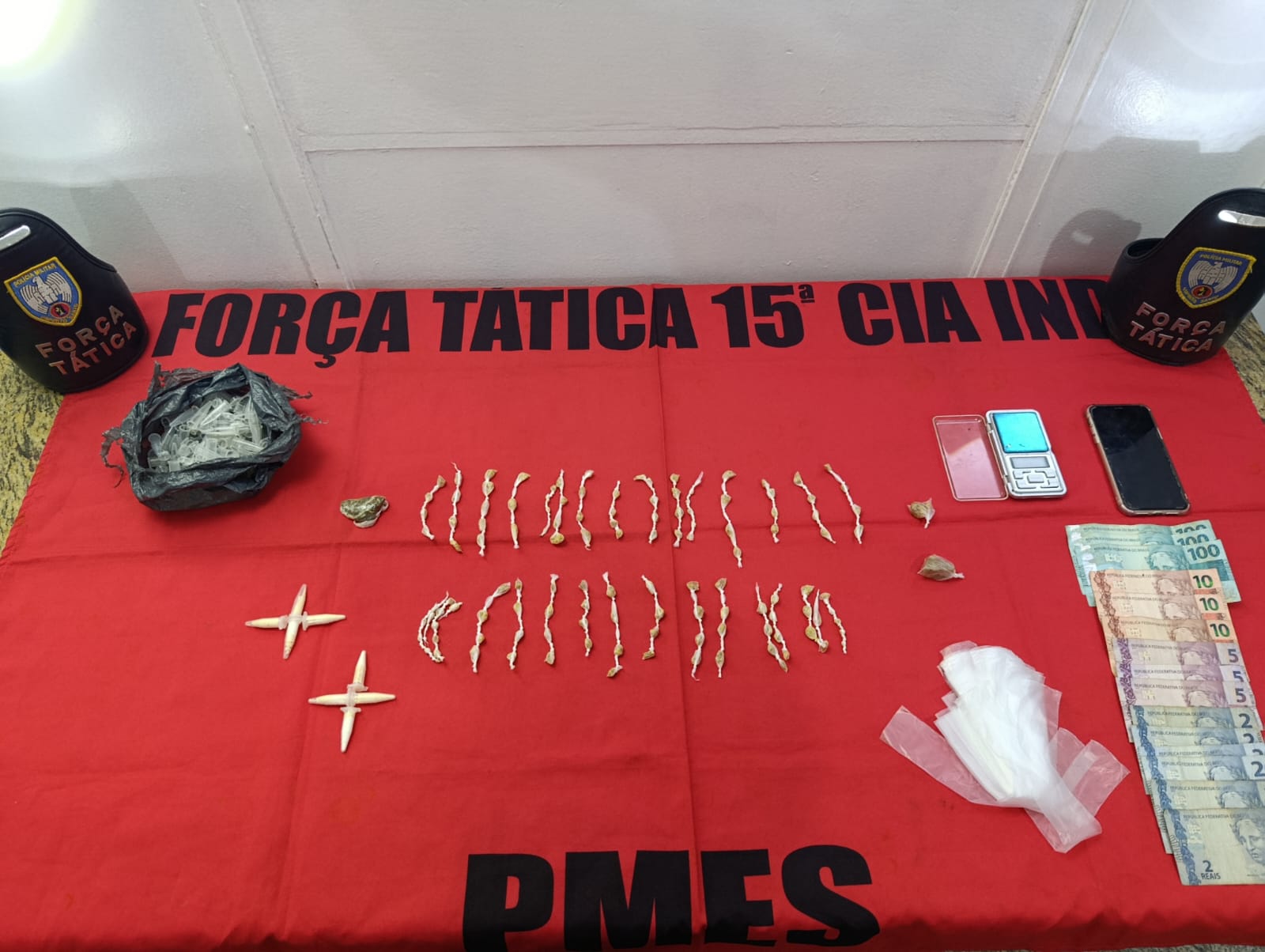 Durante as buscas, os policiais também localizaram uma balança de precisão e materiais utilizados para embalar entorpecentes. Esses objetos costumam ser utilizados no preparo e fracionamento de drogas para venda.