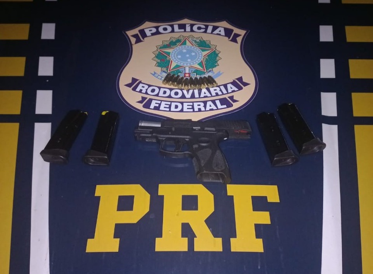 Durante a vistoria, os agentes localizaram uma pistola Taurus G2C, calibre 9 milímetros, no porta-luvas do veículo. A arma estava carregada e pronta para uso.