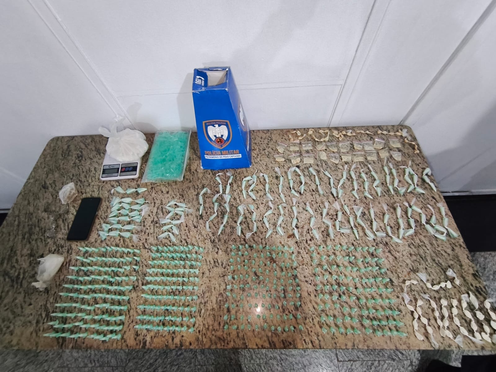 Além dos entorpecentes, a equipe recolheu uma balança de precisão e um aparelho celular. Esses itens reforçam a suspeita de comercialização no local.