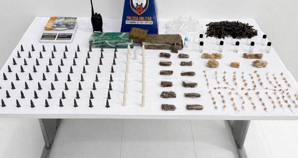 Os militares também apreenderam uma balança de precisão, um rádio comunicador e R$ 24 em dinheiro. Durante a abordagem, o suspeito afirmou que as drogas pertenciam a outro indivíduo.