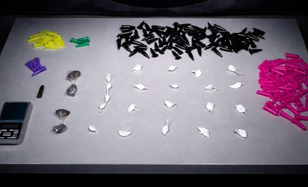 Durante a análise do conteúdo, a equipe localizou 21 papelotes de cocaína e quatro buchas de maconha. Além disso, os policiais encontraram uma munição calibre .38 e uma balança de precisão.