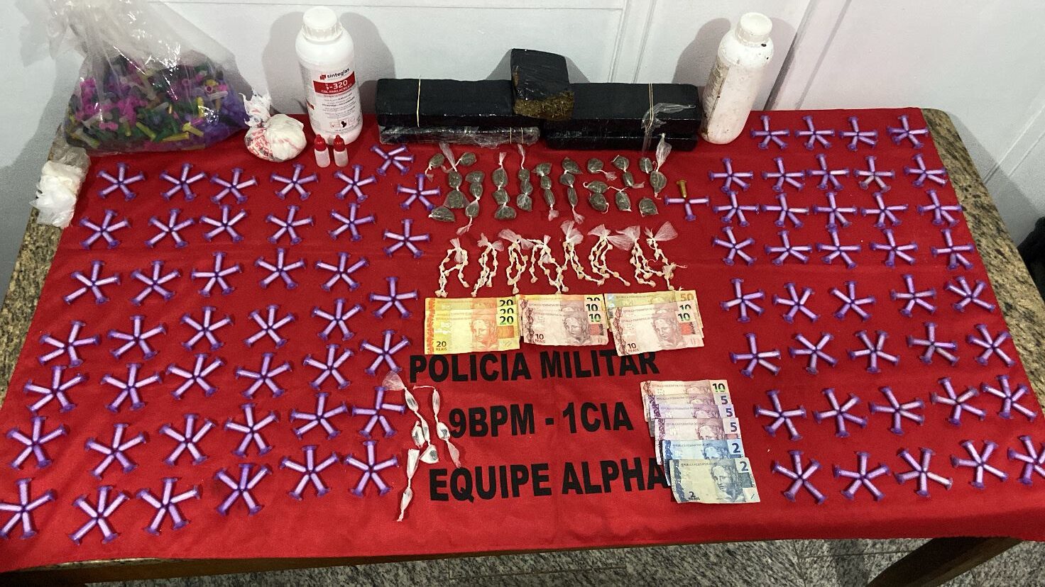 A ação também resultou na apreensão de 25 gramas de crack, totalizando 103 pedras. Ao mesmo tempo, os policiais encontraram 5 gramas de PAC, divididos em oito unidades, e 2,3 litros de loló armazenados em dois frascos grandes. Além das drogas, os agentes recolheram R$ 194 em dinheiro.