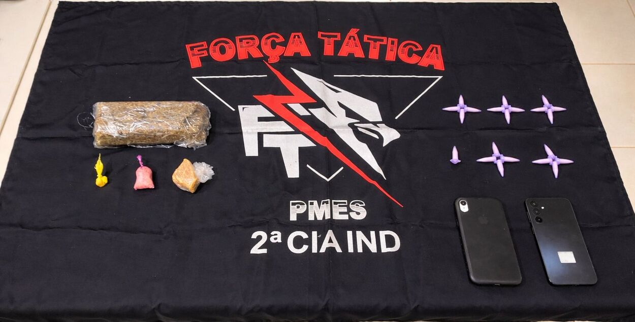 Entre os materiais apreendidos estão um tablete de maconha, uma pedra grande de crack, três pedras menores da mesma substância e 21 pinos de cocaína. Ainda assim, os agentes recolheram dois celulares e o veículo utilizado pelos suspeitos.