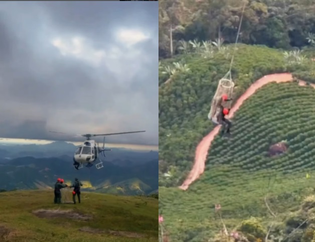 Devido às condições geográficas do local, a tripulação do helicóptero Harpia 06 utilizou o cesto de resgate para realizar a retirada da vítima com segurança.