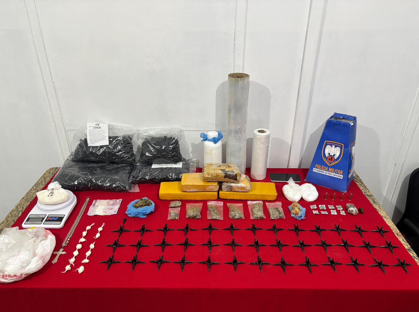 Além disso, os militares apreenderam quatro munições calibre .38, uma balança de precisão e materiais usados para embalar drogas.