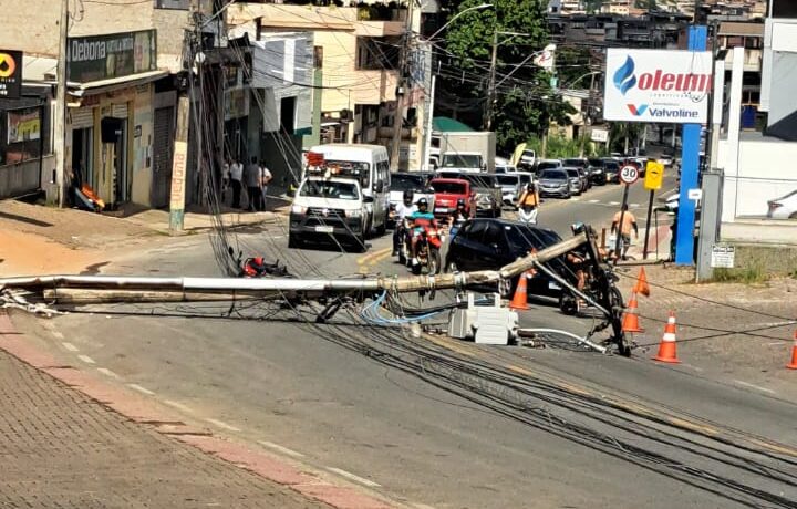 Queda de postes em Cachoeiro atinge motociclista e complica trânsito na Avenida José Rosa Machado nesta segunda.