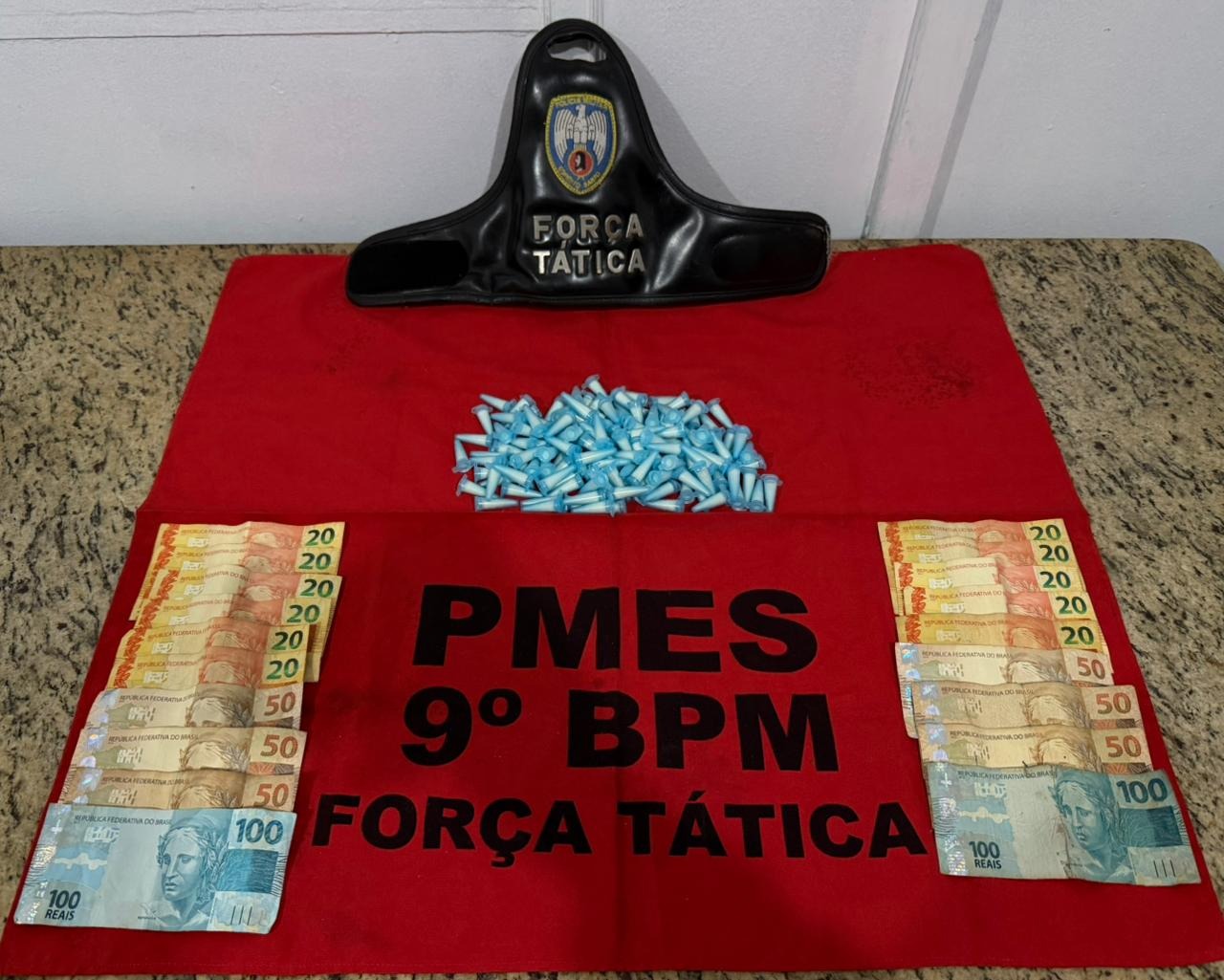 Durante buscas no ponto onde os suspeitos estavam, os militares encontraram uma sacola branca contendo 138 pinos de cocaína, totalizando cerca de 190 gramas, além de R$ 720 em dinheiro.