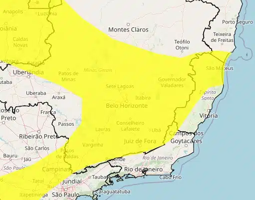 Com grau de severidade de perigo potencial, o alerta é válido até às 10h desta sexta-feira (26), e prevê chuva entre 20 e 30 mm/h ou até 50 mm/dia, ventos intensos (40-60 km/h). Baixo risco de corte de energia elétrica, queda de galhos de árvores, alagamentos e de descargas elétricas.