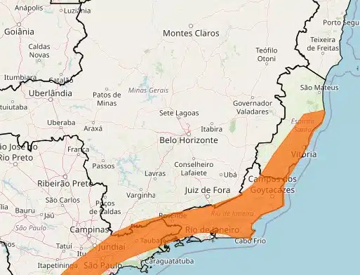 Receba as principais notícias no seu WhatsApp! clique aquiCom grau de severidade de perigo, o alerta laranja é válido até às 10h deste sexta-feira (26), e prevê chuva entre 30 e 60 mm/h ou 50 e 100 mm/dia, ventos intensos (60-100 km/h), com risco de corte de energia elétrica, queda de galhos de árvores, alagamentos e de descargas elétricas.