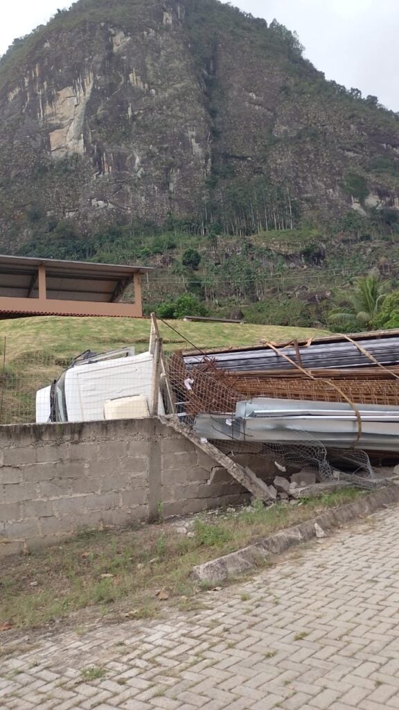 Um caminhão carregado com materiais de construção perdeu o freio e tombou na tarde desta quarta-feira (8), na Serra do Patrimônio do Ouro, em Castelo.