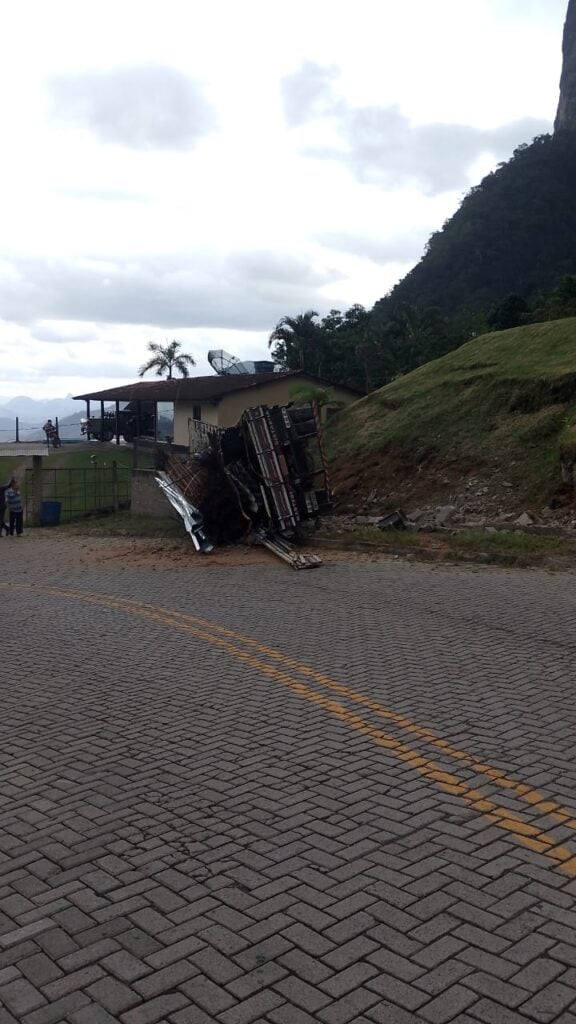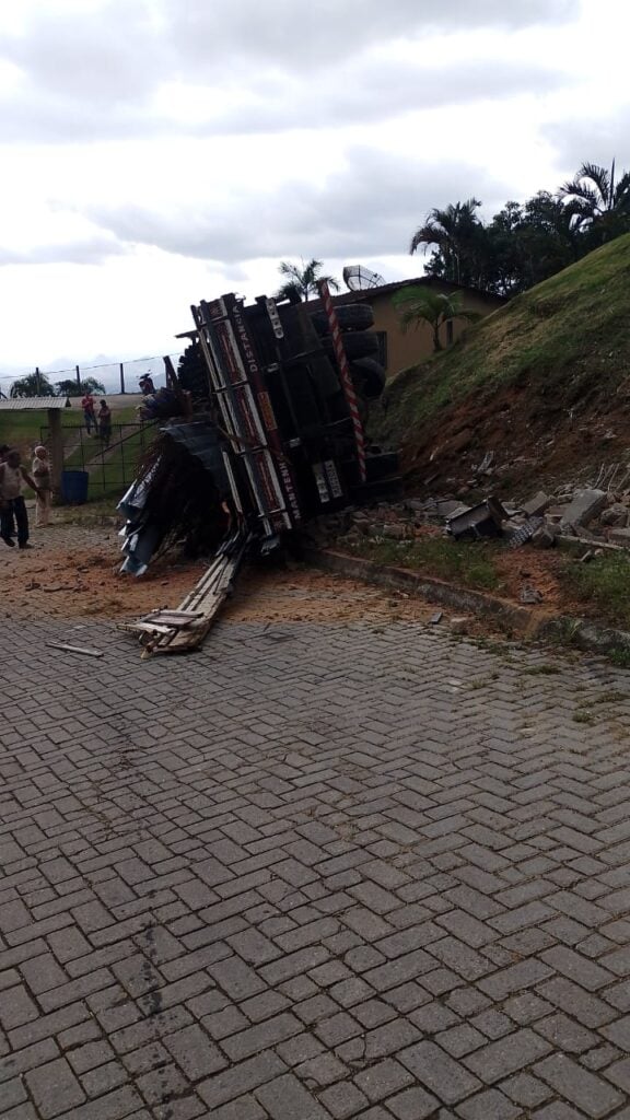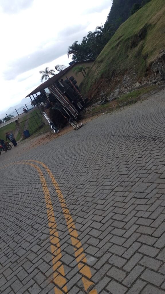 Segundo moradores, o veículo descia a serra quando o motorista perdeu o controle na curva e o caminhão acabou batendo em um muro e tombando na lateral da via. Apesar do impacto e dos danos materiais, o motorista saiu ileso.