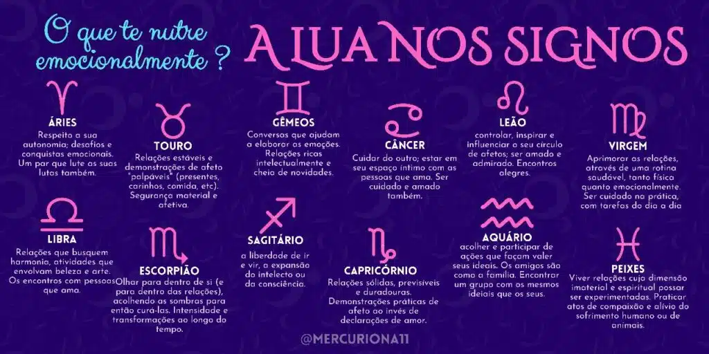 O signo onde a Lua está no seu mapa astral indica a forma como você expressa suas emoções e como você, instintivamente, reage às situações do dia a dia. Nunca é demais dizer que outros planetas, como Vênus, e os aspectos que a Lua forma no seu mapa, também vão influenciar, por isso, a importância de uma análise completa do seu mapa de nascimento.