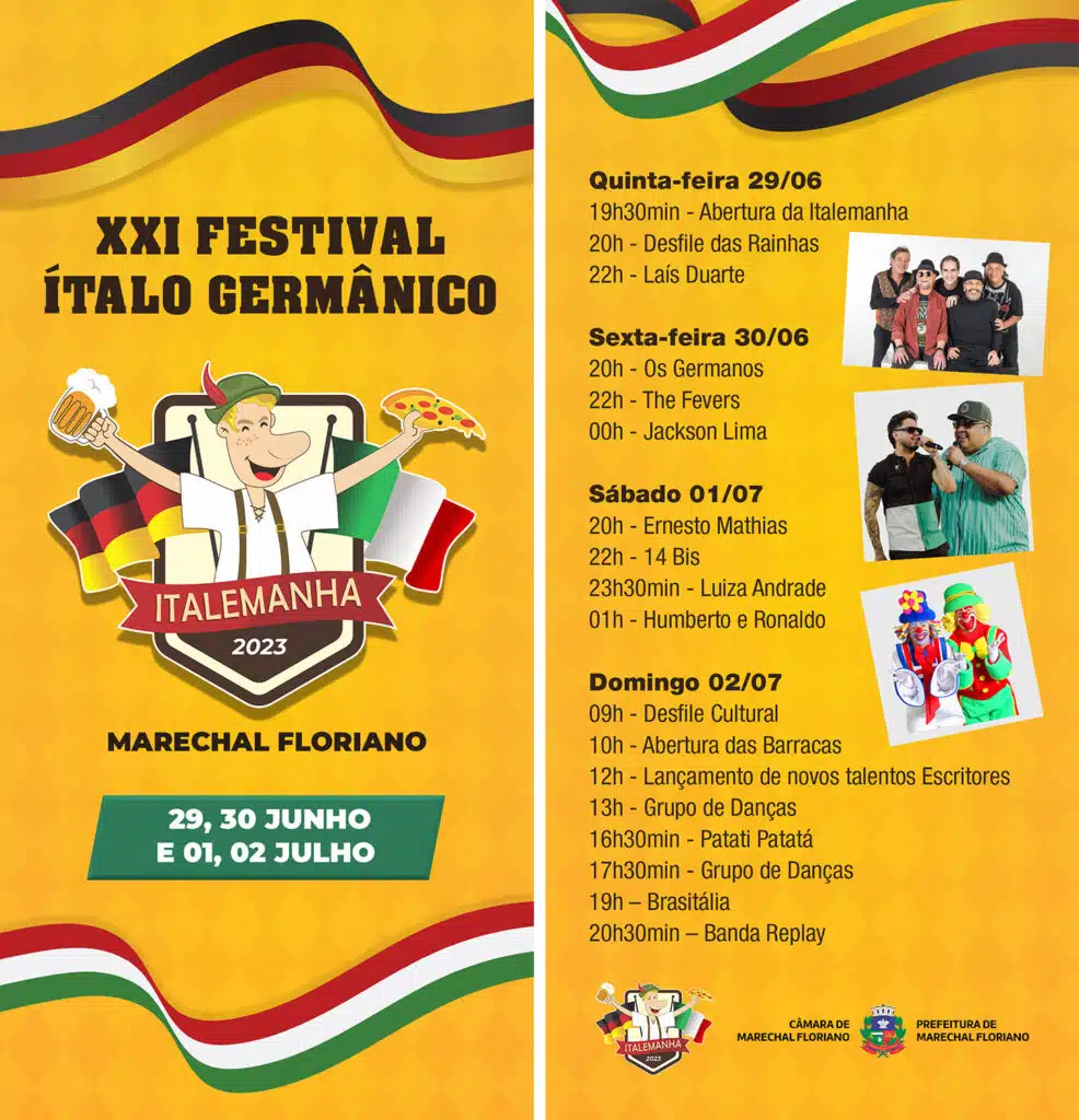 Em Marechal Floriano, na região Serrana, ocorrerá o 21º Festival Ítalo Germânico, popular Italemanha. O evento trará atrações para todos os públicos, incluindo duas bandas nacionais: The Fevers e 14 Bis. O festival terá início com o desfile das rainhas e princesas das etnias alemã e italiana. Ao longo dos dias, haverá apresentações musicais, a exemplo de Os Germanos e Jackson Lima. Além disso, o sábado contará com shows de Ernesto Mathias, Banda 14 bis, Luiza Andrade e Humberto e Ronaldo. No último dia, domingo, haverá atrações culturais e programação especial para as crianças, incluindo desfiles culturais e barracas de comida, além de apresentações de dança e da banda Brasitália (*Confira programação completa abaixo!).