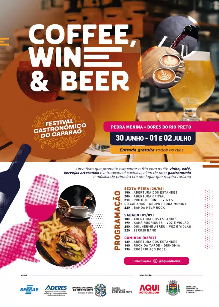 A Feira do Café, do Vinho e da Cerveja será parte da 6ª edição da Feira Gastronômica do Caparaó, realizada em Dores do Rio Preto. Organizado pelo portal Aqui Notícias e Gestão de Eventos, o evento conta com apoio do governo estadual, Aderes, Sebrae/ES e prefeitura local, e ocorrerá na rua principal do distrito de Pedra Menina, totalmente aberto ao público.
