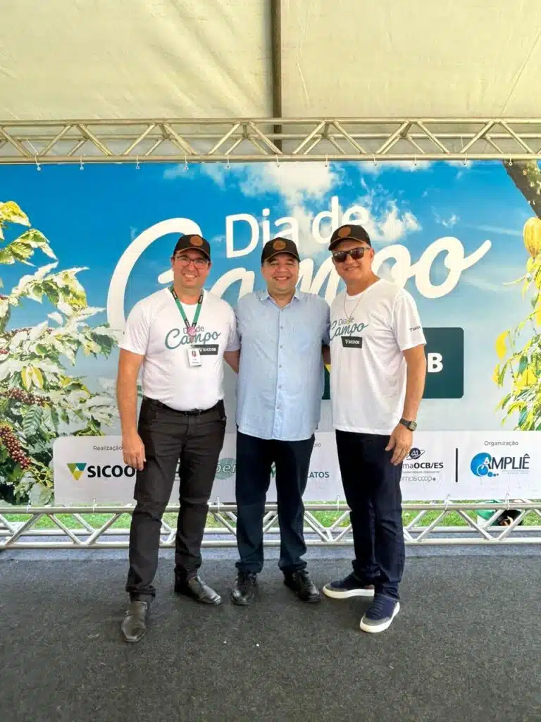 Na foto, Fabio Villela, gerente agência Sicoob Pinheiros; Poliano Bastos, membro do Comitê de ESG do IBEF-ES; e Nivaldo Mauri, diretor de Negócios do Sicoob-ES durante o Dia de Campo, uma parceria entre o Ibef-Es e o Sicoob-ES