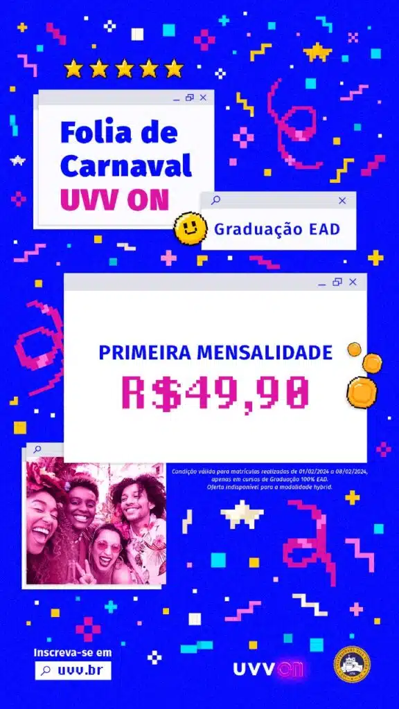 A Universidade Vila Velha (UVV), eleita a melhor universidade particular do Brasil, Polo Cachoeiro de Itapemirim, está proporcionando uma oportunidade única para quem busca ingressar em cursos de graduação EAD: a primeira parcela será de apenas R$ 49,90 (Clique aqui e garanta sua inscrição). As inscrições para os cursos de diversas áreas, como: humanas, exatas, negócios e saúde, estão abertas até o dia 8 de fevereiro.