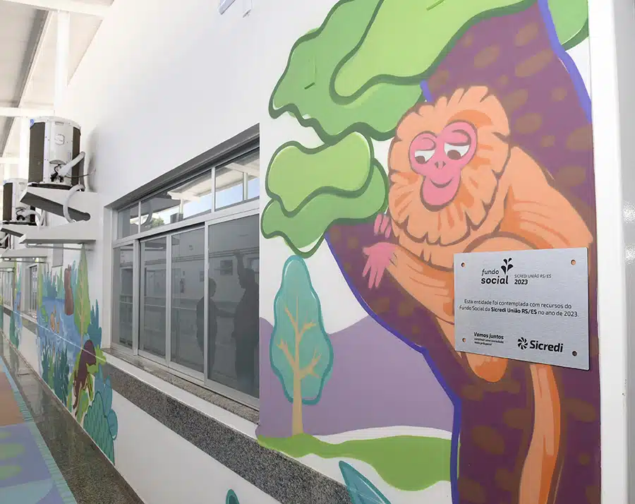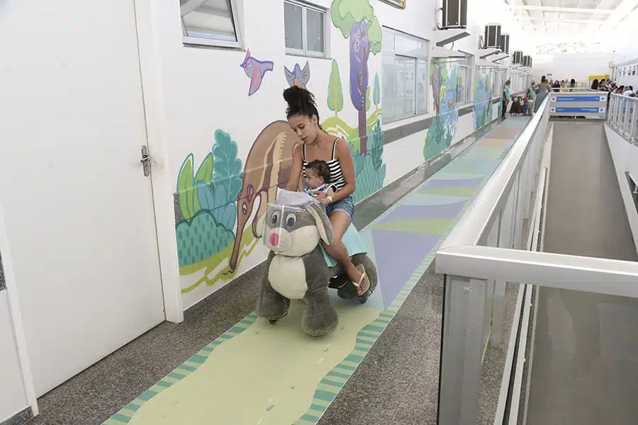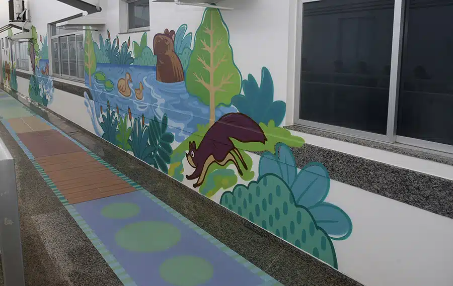 Além dos bichinhos elétricos, o projeto traz a floresta, suas folhagens e animais para dentro do hospital. Estampados nas paredes e também no chão, transformam o corredor em um “Caminho Melhor” pintado a mão pelo artista Rudson Costa. As tintas utilizadas foram antialérgicas e o chão ganhou uma película protetora.