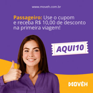 Para celebrar a chegada da Movêh em Cachoeiro de Itapemirim, estamos oferecendo um desconto especial para novos usuários. Use o código AQUI10 e ganhe R$ 10,00 de desconto na sua primeira corrida (com valor mínimo de R$ 10,00)! Não perca essa oportunidade de experimentar um serviço de transporte que realmente faz a diferença.