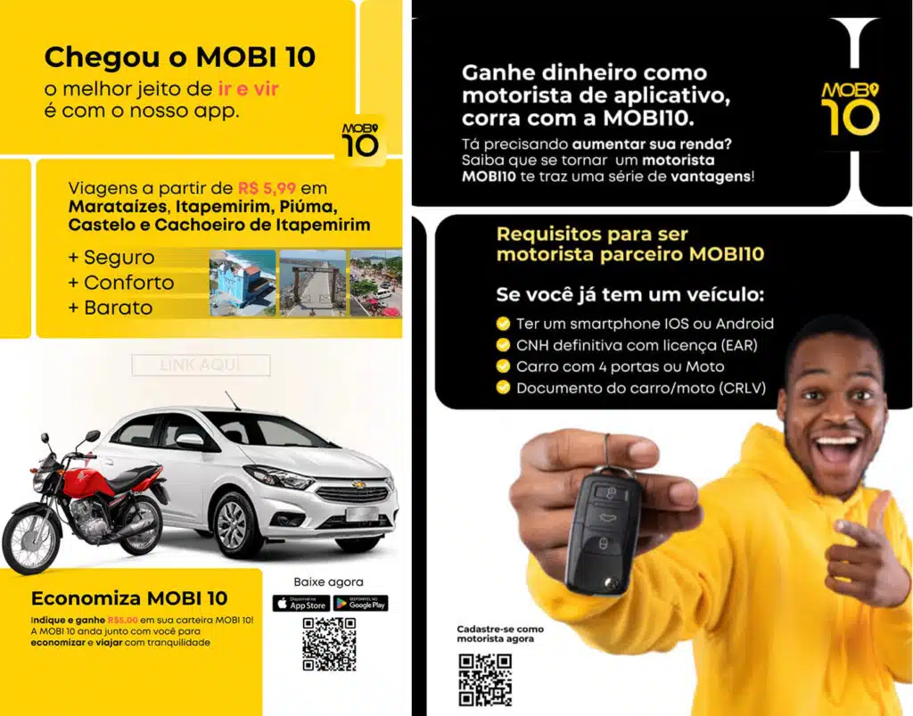 Receba as principais notícias no seu WhatsApp! clique aquiA MOBI 10 já está atuando nos municípios de Cachoeiro de Itapemirim, Castelo, Itapemirim, Marataízes e Piúma. O gestor da empresa Josimar Dias garante que a plataforma prioriza um serviço de segurança e qualidade aos passageiros, além de ofertar condições diferenciadas para motoristas que desejem aderir à empresa.