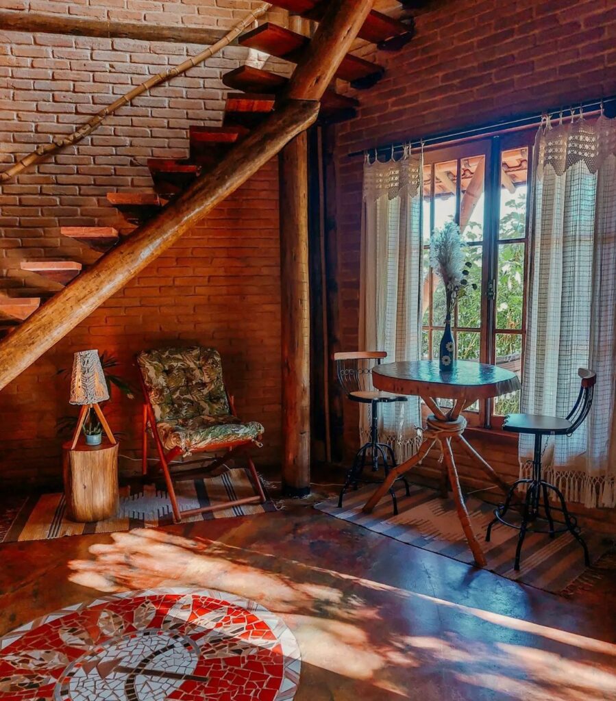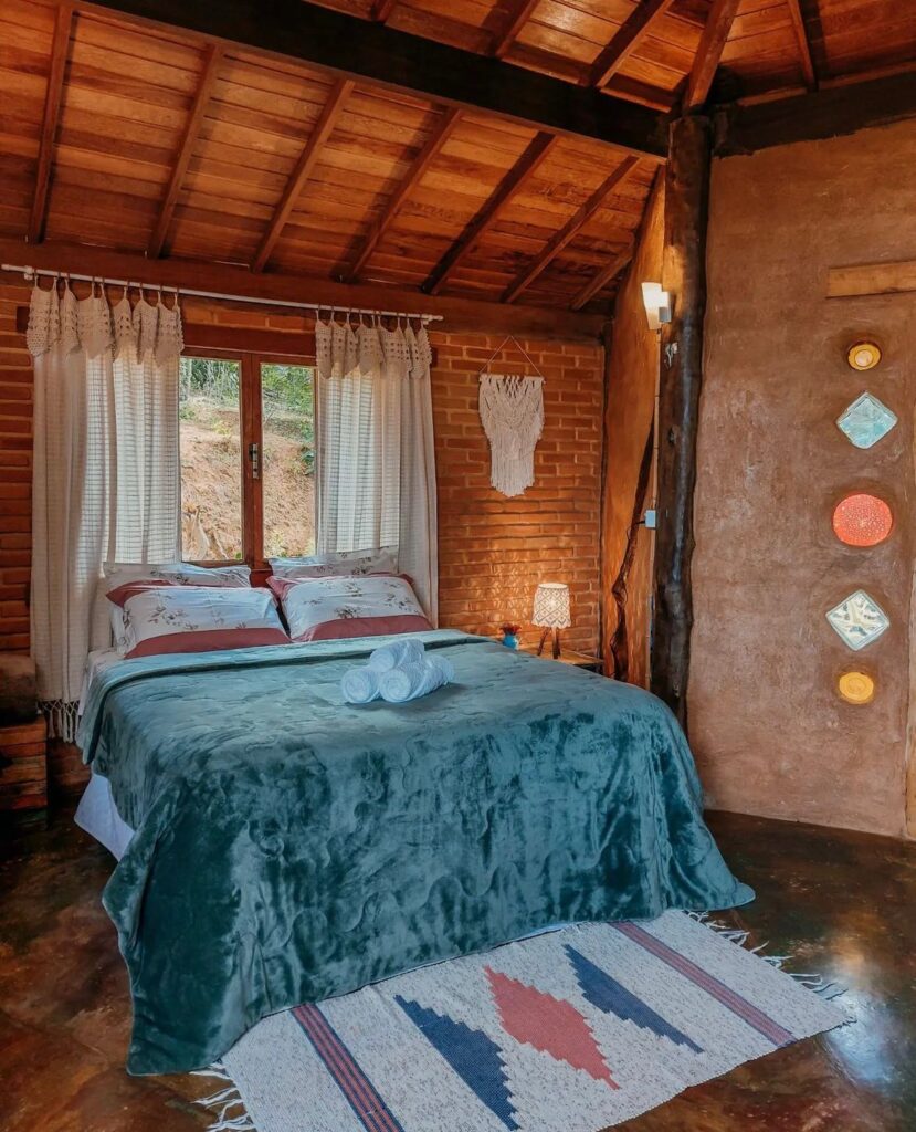 Em meio à Mata Atlântica, a Aldeia Alegria conta com bangalôs feitos de barro e bambu. Marcius Gomes destaca o diferencial da hospedagem desde os materiais usados na construção. Ele afirma que essa estética foi pensada para envolver o visitante ao ambiente que ele está.