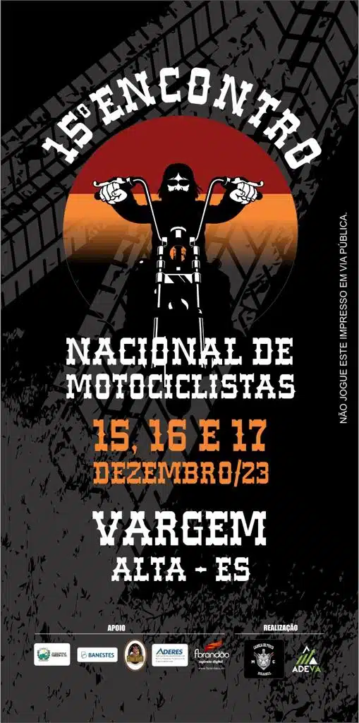 Vem aí: O 15º Encontro Nacional de Motociclistas em Vargem Alta será realizado nos dias 15,16 e 17 de dezembro, no Parque de Exposição da cidade. O evento é promovido pelo Motoclube Cabeça de Porco e vai contar com três dias de programação.
