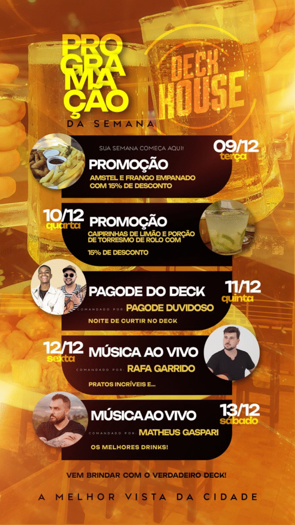 O Deck House mantém a proposta de entregar ritmo, sabor e boa experiência ao público. Entretanto, a equipe reforça que reservas antecipadas garantem mais conforto durante as atrações.