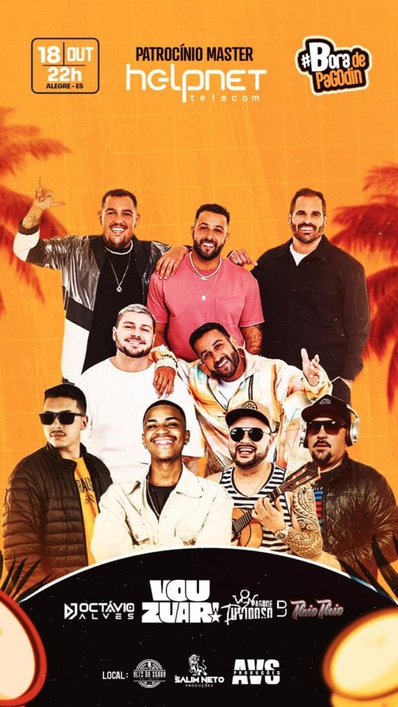 Neste sábado (18), a partir das 22h, o evento #BoraDePagodin traz a banda nacional Vou Zuar, sucesso com hits como “Chato pra Carai” e “Salseiro”. A noite ainda terá a animação da banda Pagode Duvidoso e dos DJs Thio Thio e Octávio Alves, garantindo um clima de festa do início ao fim.