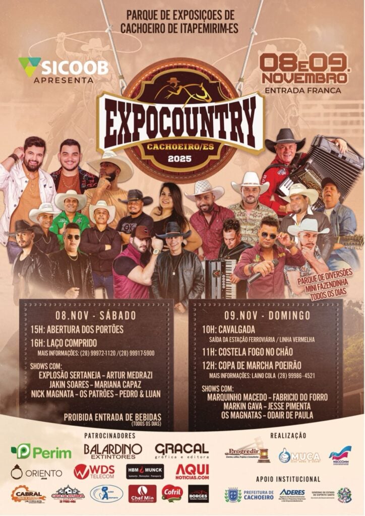 Nos dias 8 e 9 de novembro de 2025, o Parque de Exposições será palco da Expocountry Cachoeiro. Aliás, a programação reúne o melhor do universo equestre e rural, com atrações para todos os públicos.