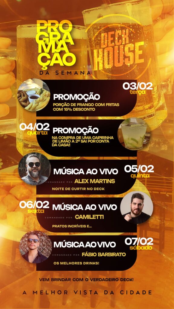 No sábado (07/02), o Deck House encerra a semana com música ao vivo de Fábio Barbirato. A noite destaca os drinks da casa e reforça o convite para quem busca aproveitar o sábado em um ambiente animado e bem estruturado.