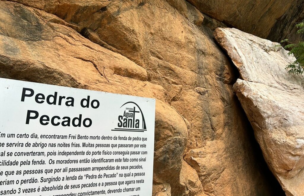 Outro ponto que desperta curiosidade é a chamada Pedra do Pecado. Trata-se de uma fenda entre rochas, onde, conforme a crença popular, a pessoa deve passar três vezes da direita para a esquerda para obter redenção. Entretanto, a tradição afirma que, se a fé não for suficiente, o visitante pode ficar preso e só será liberado com a presença de um padre. Assim, o local combina devoção e simbolismo em uma experiência marcante.