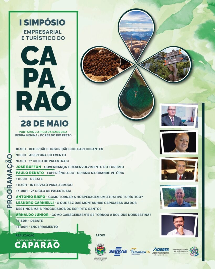 A Agência de Desenvolvimento Caparaó vai realizar o 1° Simpósio Empresarial e Turístico do Caparaó, no dia 28/05, em Pedra Menina, Dores do Rio Preto/ES. O evento será gratuito e contará com a participação de renomados palestrantes nacionais.
