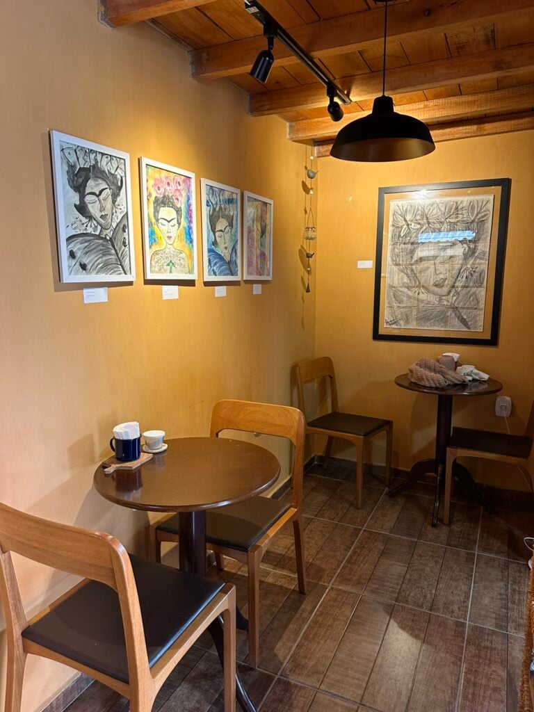A hospedagem conta com 6 quartos e a cafeteria disponibiliza uma lista de opções de cafés especiais, além de comidas deliciosas. De acordo com Margô, grande parte dos cafés especiais são produzidos na própria região. “Trabalhamos com o café Relíquias do Caparaó, por exemplo. Daqui dá pra você ver a plantação deles. Fica aqui em Patrimônio mesmo.” comenta.